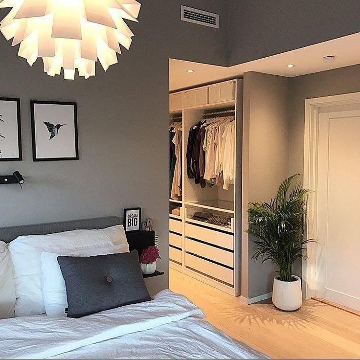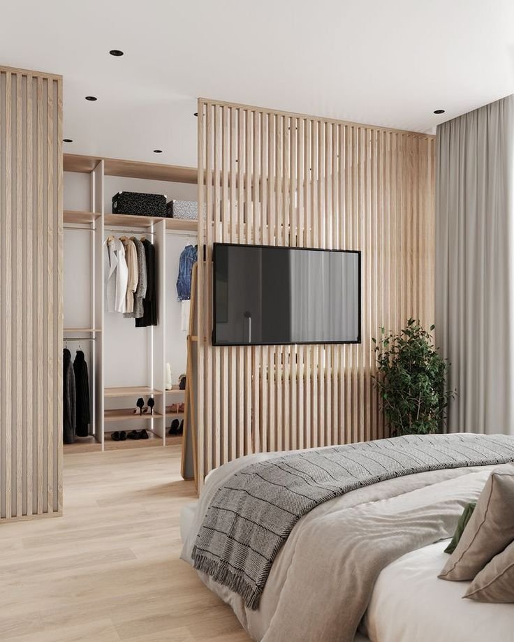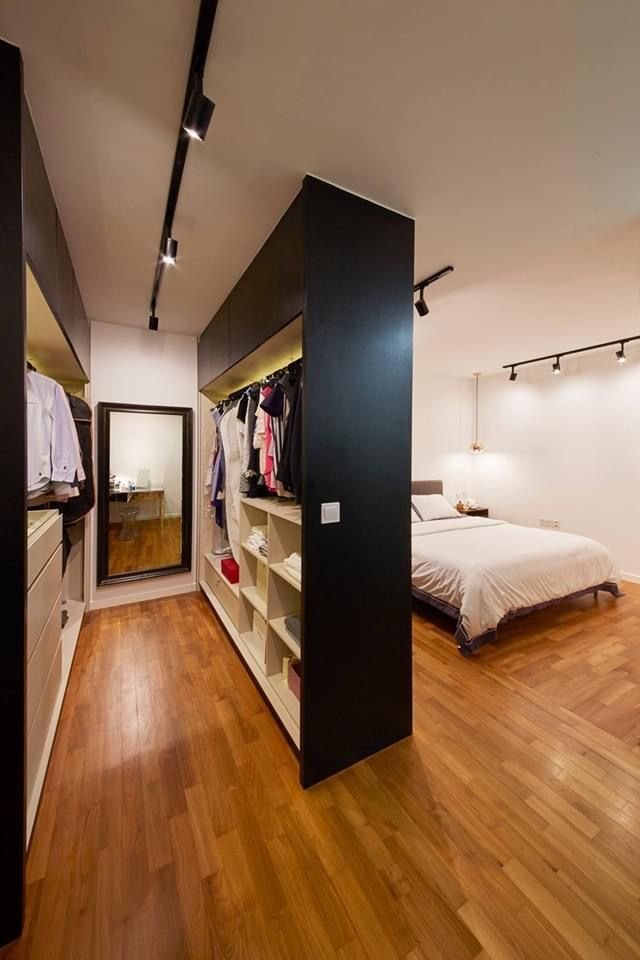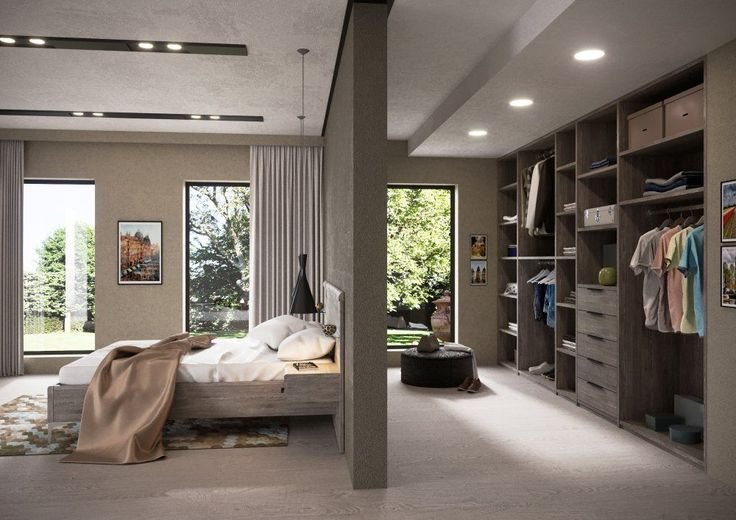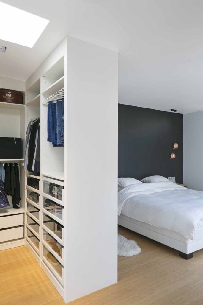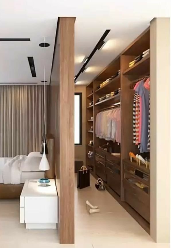 Dividen la habitación: Si tu habitación es grande este tipo de vestidor será muy cómodo para ti, se divide la habitación tomando una zona para dormitorio y la otra para armario.